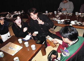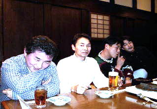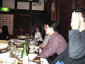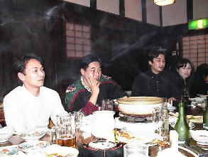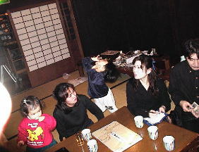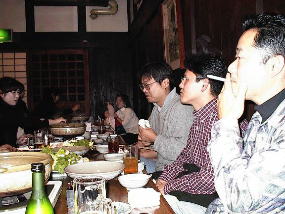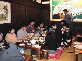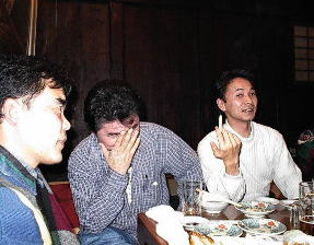 うう〜〜ん・・・奥はこんな感じで・・・昔の庄屋なんですが・・蔵を使ってます!ちなみにみんな元気がないんじゃぁありません・・・鍋が出来るのを待っているんです・・・けど、恭平さんは・・・生食ってる(笑) けんたさんは・・・不味かったようで・・(笑) 後ろの絵画は・・・skoyamaさんが立っているのです・・・うひょひょ |