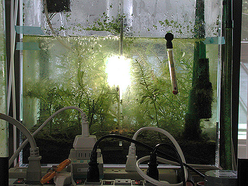 | こんな感じに、照明の周りに細いつる状の草が綿の様に繁殖し、水中の窒素分の除去をしています。照明の光が全然見えません。 |